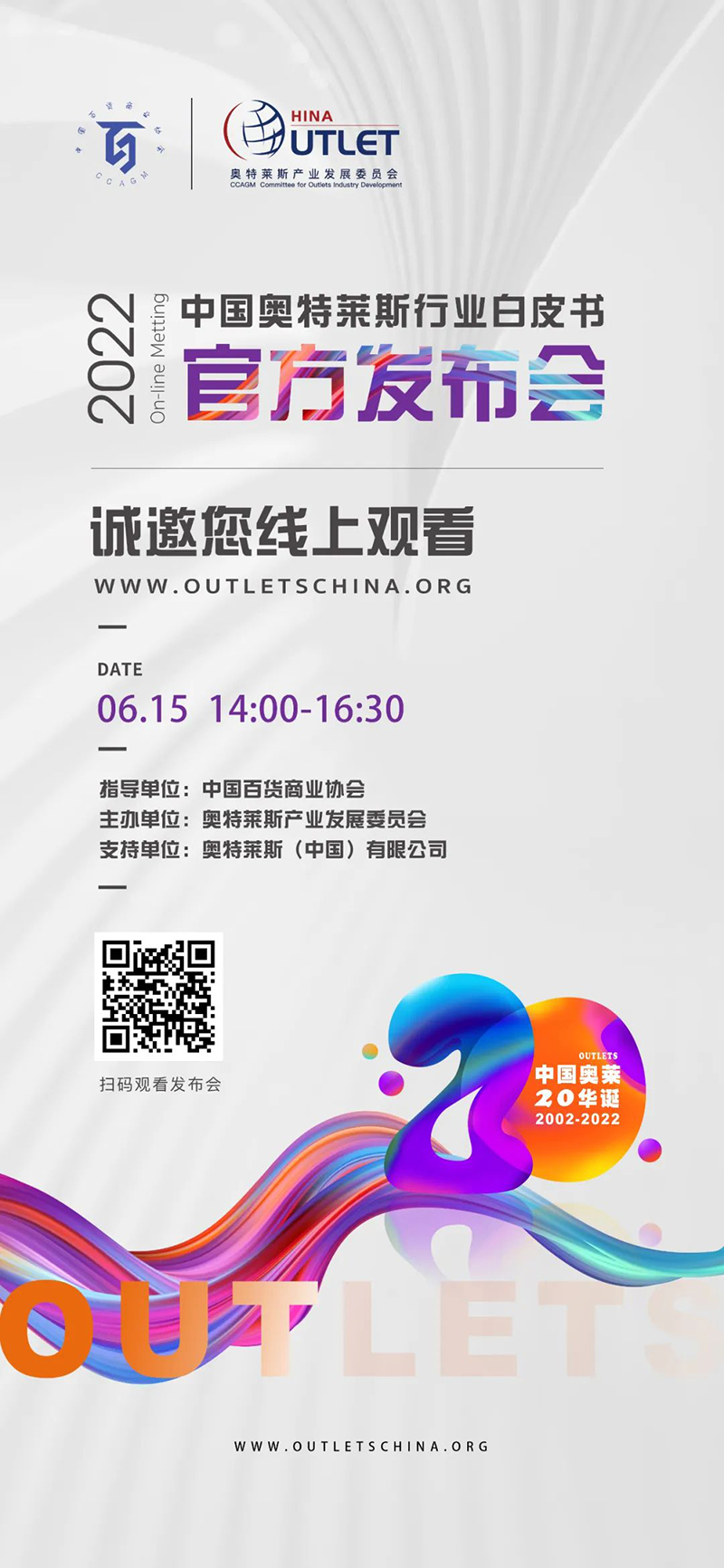 6月15日14:00,點擊奧特萊斯產(chǎn)業(yè)發(fā)展委員會官方網(wǎng)站(http://www.outletschina.org),《2022年中國奧特萊斯行業(yè)白皮書》線上發(fā)布會直播間誠邀您的觀看。
