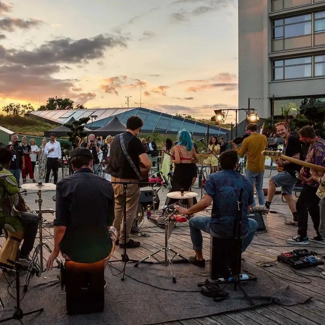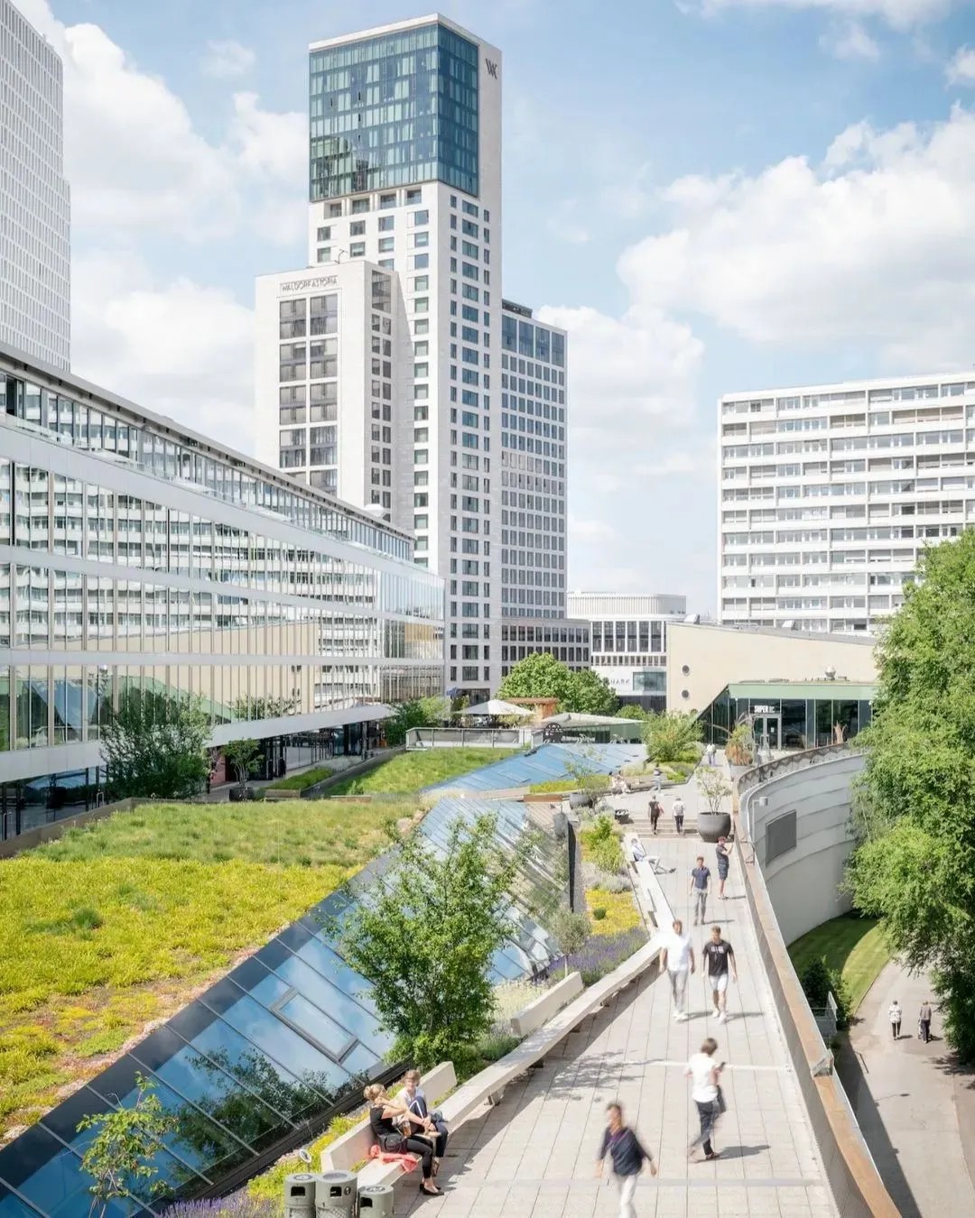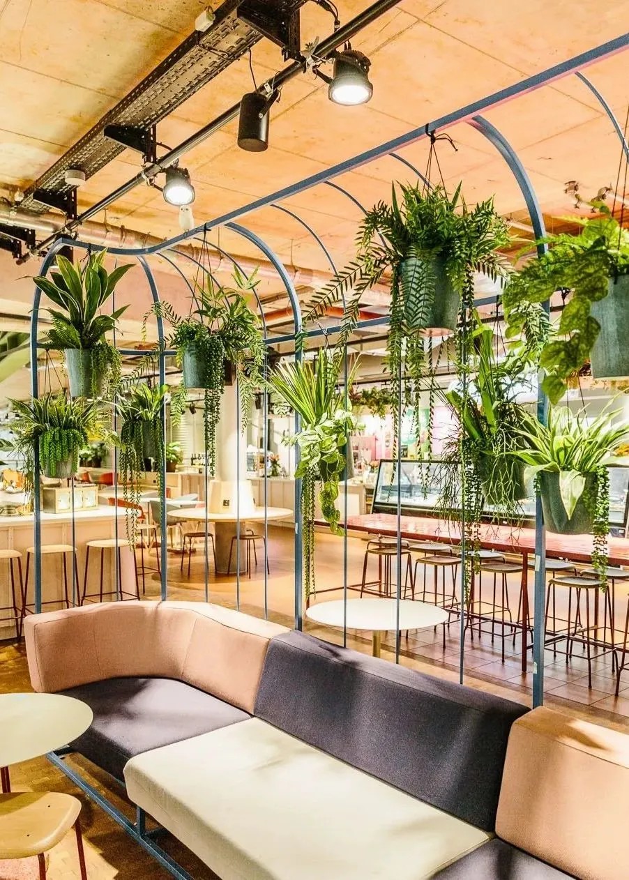 在商業(yè)的二層則設(shè)置了一個(gè)開放、通透的公共空間,同柏林潮流酒店25小時(shí)(Twenty five hours hotel)進(jìn)行聯(lián)通。并以城市綠洲為設(shè)計(jì)概念,在頂層設(shè)計(jì)了一個(gè)布滿植物盆栽的七千平方公尺的天臺(tái),供給顧客休憩社交,營造自由、無拘束的商業(yè)氛圍,與項(xiàng)目的整體定位相得益彰。