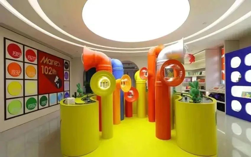 Mamǎfufú將“小紅閑”這一概念發(fā)揮得淋漓盡致,無論是整體的場景風(fēng)格,對于色彩的靈活運(yùn)用,還是互動(dòng)體驗(yàn)的內(nèi)容和品牌首店引入,都創(chuàng)造了極高的出片效果,吸引眾多年輕人前來打卡消費(fèi)。Mamǎfufú超級(jí)百貨是一個(gè)跨界聯(lián)合的潮流文創(chuàng)空間,占據(jù)了M+馬利位置最好的沿街二樓,無論室外的墻體,還是室內(nèi)的布置,均大面積運(yùn)用了極具張力的紅黃藍(lán)三原色,將“馬利”這個(gè)百年顏料品牌的“色彩主義”貫穿于整體空間設(shè)計(jì)中。1000㎡的空間內(nèi)營造了8個(gè)主題區(qū)域,設(shè)置馬利趣味工廠、馬利畫材、POP-UP Market、色彩理想國、靈感書集、色彩生活集市、色彩沙龍等主題區(qū)域,涵蓋藝術(shù)展覽、手工工作室、畫材、圖書、生活家居、藝術(shù)衍生、服裝零售等多種業(yè)態(tài)內(nèi)容。