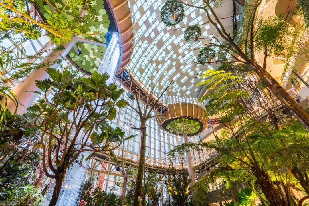 在重慶光環(huán)的深處,自然與商業(yè)的邊界被徹底打破。位于中央的15米高“生命之樹”(鳳凰木)巍然矗立,與20多米的“花之瀑谷”及40米高空的“懸浮森林”共同繪制出三大夢(mèng)幻場(chǎng)景。瀑布水幕高約25米,水流如絲,與來(lái)自全球的300余種、數(shù)萬(wàn)株熱帶雨林植物交織成一幅生動(dòng)的自然畫卷,讓商業(yè)空間煥發(fā)出勃勃生機(jī)。四季更迭,植物園內(nèi)景致各異,每一季都有新的色彩與故事等待被發(fā)現(xiàn)。