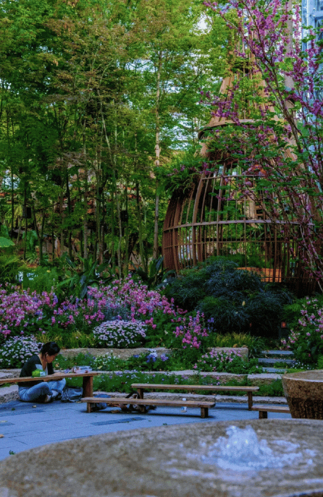 綠樹蔥蘢、繁花似錦,配合匠心獨(dú)運(yùn)的休憩布局,共同編織出一個(gè)遠(yuǎn)離塵囂的森系都市綠洲。然而,若要深入探討森系商業(yè)背后的成功秘訣,僅僅依靠視覺上的高顏值是遠(yuǎn)遠(yuǎn)不夠的。更為核心的是,它必須能夠塑造出一種獨(dú)一無(wú)二的文化氛圍與精神內(nèi)核,這種獨(dú)特的文化氣質(zhì)與靈魂,才是讓顧客心生向往、流連忘返的關(guān)鍵所在。