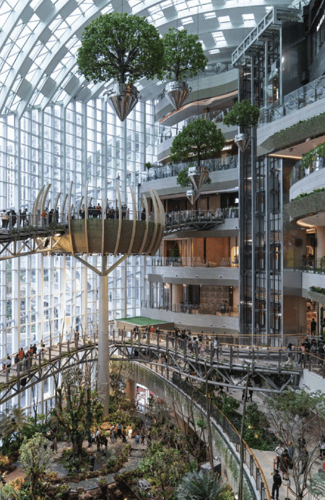 其中,「沐光森林」作為光環(huán)的標(biāo)志性景觀,以其縱跨6層、高達(dá)42米的室內(nèi)立體垂直植物園之姿,成為了眾人矚目的焦點(diǎn)。懸空其間的步行棧道,如同穿梭于綠色世界的秘徑,讓顧客在享受購(gòu)物樂(lè)趣的同時(shí),也能感受到大自然的呼吸。這條懸空跨層步道,不僅巧妙地連接了商業(yè)區(qū)域與森林景觀,更讓每一次購(gòu)物之旅都充滿了探索自然與發(fā)現(xiàn)驚喜的奇妙體驗(yàn)。