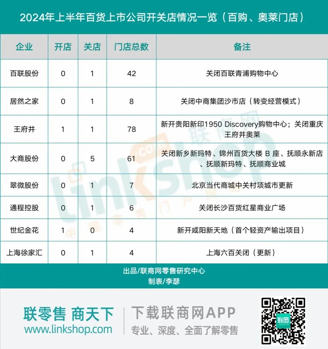 在門店的開設與關閉動態(tài)上,2024年上半年呈現(xiàn)出一個顯著的趨勢:關店數(shù)量遠超開店數(shù)量。具體而言,44家百貨上市公司在此期間僅新增了2家門店(此數(shù)據(jù)僅限于百貨商店、購物中心及奧特萊斯門店),而關閉的門店數(shù)量則達到了11家。與之形成對比的是,去年同期這些公司開關店的數(shù)量均為5家。這一變化表明,與去年相比,百貨上市公司在開設新店方面變得更加謹慎,而關閉門店的速度卻在加快。