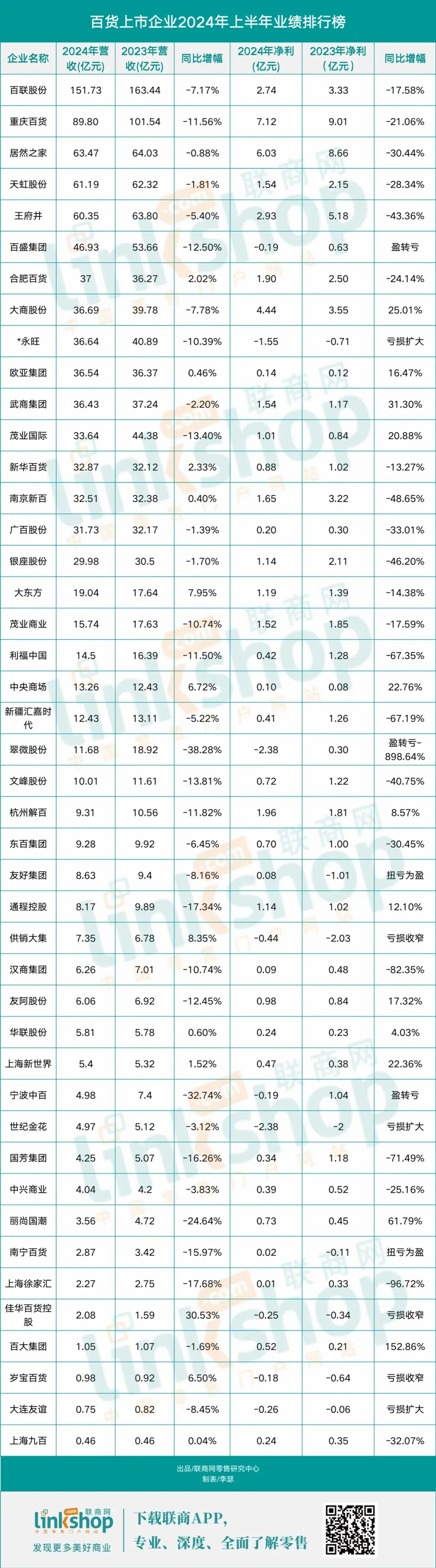 附:2024年上半年百貨上市公司業(yè)績排行榜
