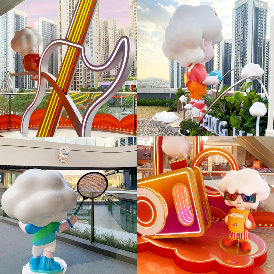 有趣的是,項目還推出了原創(chuàng)IP「多多」,作為項目與消費者對話的符號,以云朵為靈感,化身不同的角色,串聯(lián)起星空廣場、藝術(shù)連廊、屋頂公園等戶外空間場景,使獨特的記憶符號變得豐滿,憑無界創(chuàng)意加速突破商業(yè)空間界限,賦能多元互動體驗場景。