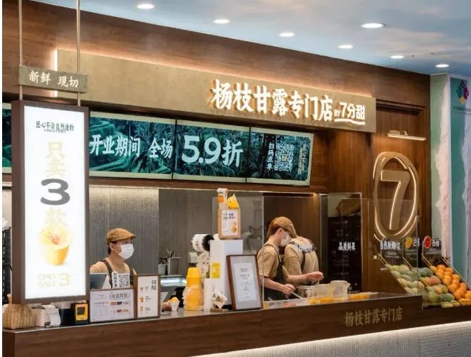 去年,七分甜的首家楊枝甘露專門店在上海長寧龍之夢開業(yè),在產(chǎn)品方面,專門店僅售三款產(chǎn)品,分別是1987經(jīng)典楊枝甘露、2007鮮芒楊枝甘露、楊枝甘露Gelato,分為碗裝、杯裝和冰淇淋,定價在15-20元。在店型方面,走小店模式,不設(shè)堂食。專門店面積大約只有20平方米左右,目前僅支持下單后排隊自取。在裝修風(fēng)格上,店內(nèi)裝修以原木配色為主,主打簡約風(fēng)。在鮮果陳列區(qū)擺放了制作楊枝甘露所需要的椰子、芒果、西柚等原料,采用明檔吧臺在顧客面前現(xiàn)切現(xiàn)做,讓消費(fèi)者直觀感受產(chǎn)品的制作流程。